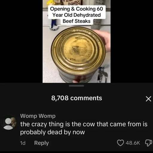 minus-squareBluewing@lemmy.worldlinkfedilinkarrow-up1·26 days agoA shoutout to steve1989! For eating US Civil War Hard Tack and Boer War canned Bully Beef! And every WW2 ration he can get. He sure can wax poetic about the flavors of each one.