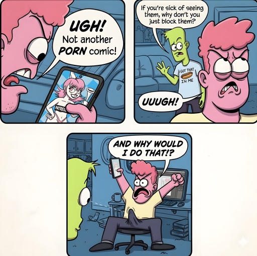 How exactly are you going to block porn comics when they’re done by different creators, and often reposted? Disabling nsfw isn’t great, either, because it’s usually a global account setting, and people are setting posts to nsfw for all kinds of bullshit reasons. And finally, some nsfw comics are genuinely good! Wouldn’t want to miss oglaf or extrafabulous. TBH, general comics communities like this one are deeply flawed when it comes to filtering; the way they’re set up, it’s often impossible to filter things out even if you were on piefed, which has much more powerful filtering options than lemmy.