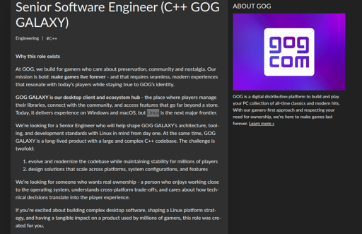mr_MADAFAKA@lemmy.ml to Linux Gaming@lemmy.worldEnglish · 3 months agoGOG is seeking a Senior Software Engineer with C++ experience to modernize the GOG GALAXY desktop client and spearhead its Linux developmentplus-squarelemmy.mlimagemessage-square9linkfedilinkarrow-up11arrow-down10