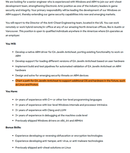 arrow-up10arrow-down1imageEA is hiring a Senior Anti-Cheat Engineer to lead development of a native ARM64 driver for their Javelin kernel anti-cheat system and start laying groundwork for Linux/Proton supportplus-squarelemmy.mlmr_MADAFAKA@lemmy.ml to Linux Gaming@lemmy.worldEnglish · 2 months agomessage-square2linkfedilink